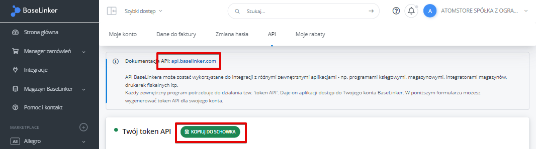 1. Przejdź do panelu zarządzania w BaseLinker, a następnie przejdź do Moje konto → API. Skopiuj swój token do schowka.