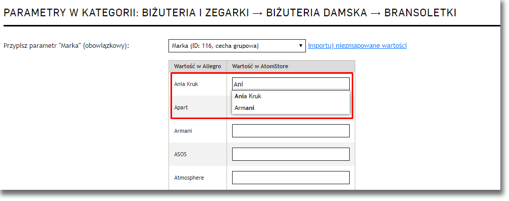 W każdej z kategorii Allegro określ brakujące wartości w AtomStore. Po kliknięciu “Zapisz” atrybuty kategorii zaktualizują się we wszystkich szablonach.