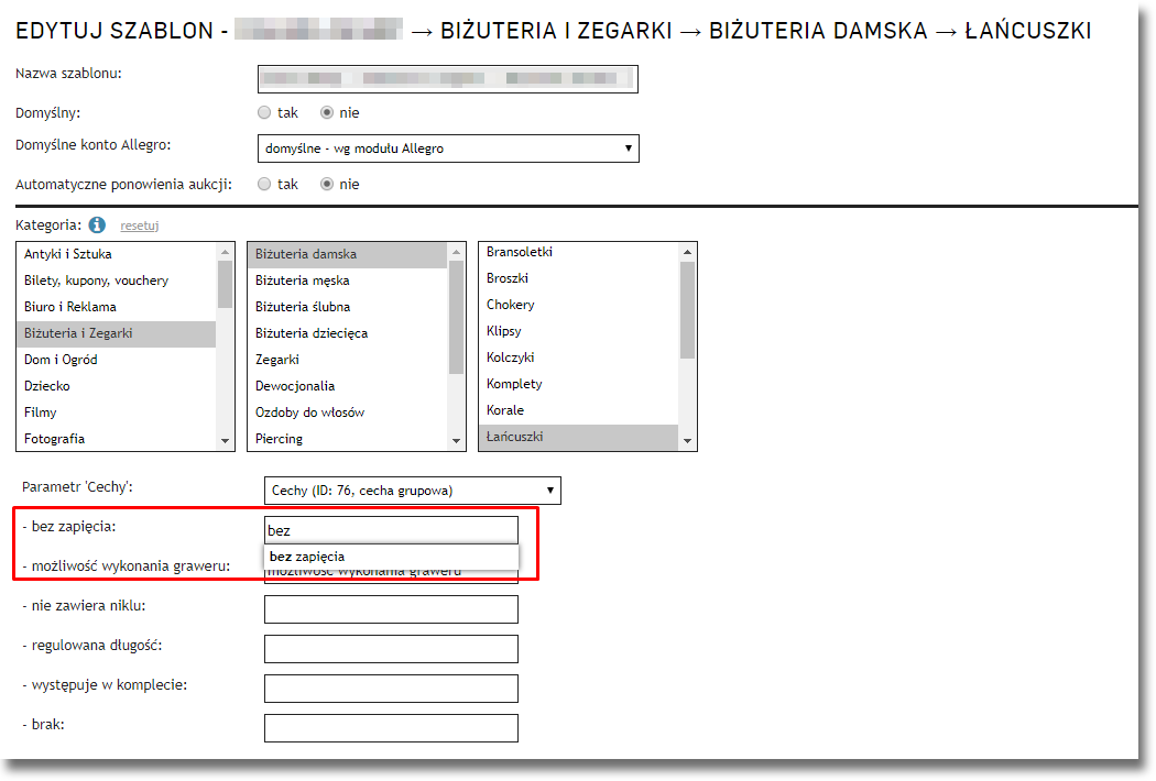 Alternatywą jest ręczne zmapowanie kategorii atrybutów. Można to zrobić w poszczególnych szablonach aukcji Multichannel → Allegro - szablon → wybrany szablon → Edycja. W każdym szablonie, gdzie brakuje atrybutów, należy uzupełnić ręcznie.