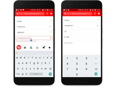W wersji mobilnej duży nacisk postawiliśmy na użyteczność formularzy. Przede wszystkim w walidują poprawność danych do zamówienia na bieżąco (użytkownik nie traci czasu na poprawianie danych, nie musi przechodzić do następnego kroku, aby dowiedzieć się o błędnym adresie e-mail). Dodatkowo, w polach jak numer domu/mieszkania, numer telefonu, kod pocztowy oraz e-mail pojawi się klawiatura numeryczna, która sprawia, że wypełnienie formularza jest jeszcze wygodniejsze.