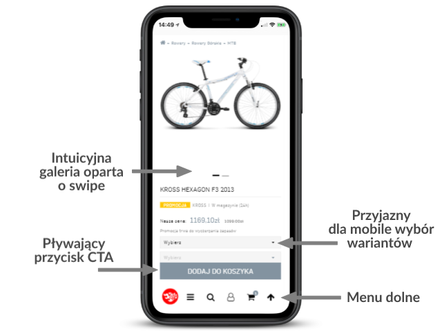Lifting pod mobile przeszła również karta produktu. Zmiany zaszły w wyświetlaniu galerii (zrezygnowaliśmy z miniaturek zdjęć, które pozostały na desktopie). Pojawił się nowy sposób wyboru wariantów, czyli rozwijana lista rozmiarów czy kolorów produktu. Dużą zmianą jest przycisk KUP widoczny tuż po załadowaniu strony. Płynnie przechodzi po ekranie w zależności od ruchu użytkownika.
