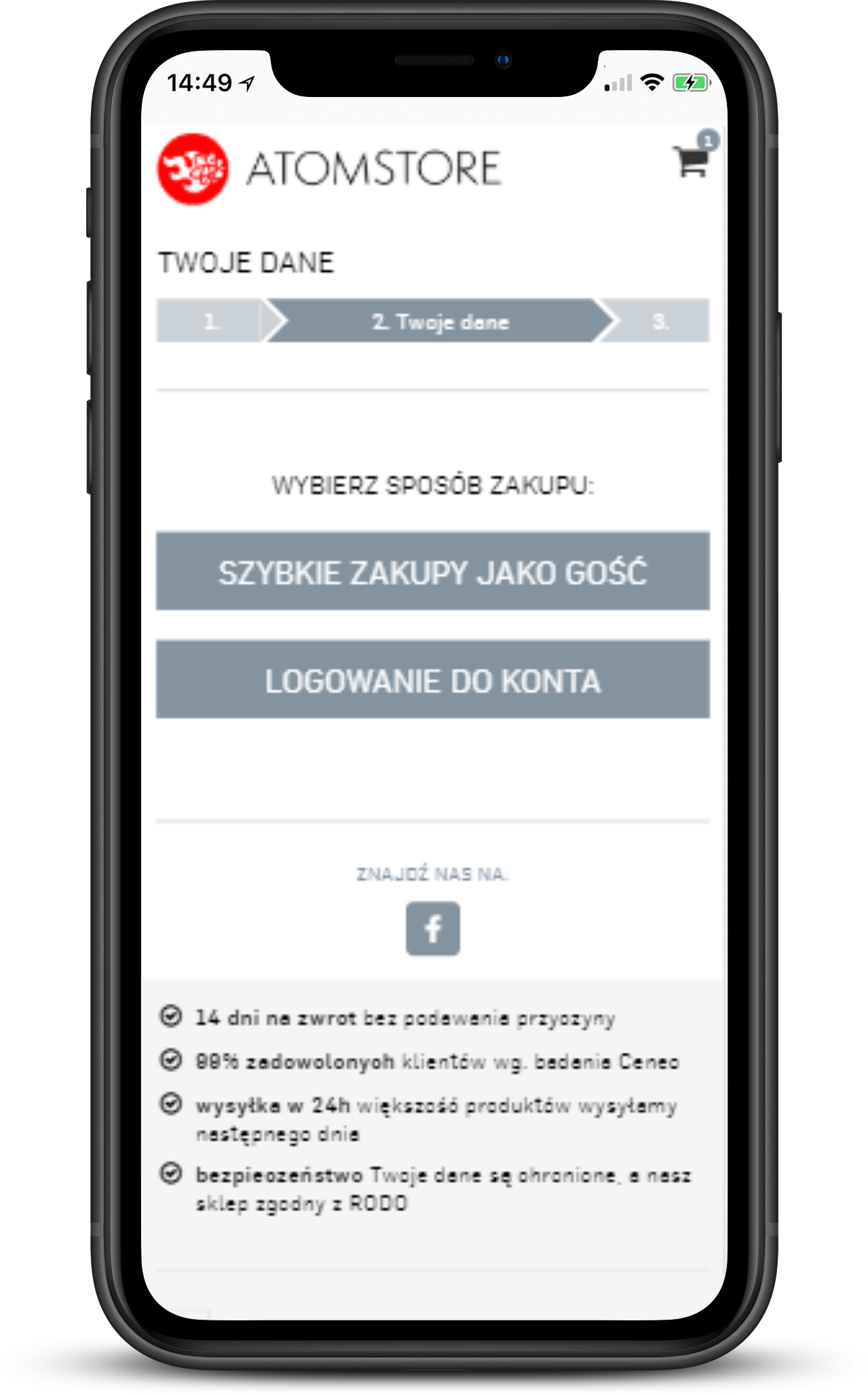 Proces zakupów to trzy kroki - o to na jakim etapie znajduje się użytkownik informuje go pasek postępu na górze. Na dole znajduje się informacja o korzyściach zakupów w Twoim sklepie np. gwarantowane prawo zwrotu lub informację o szybkości realizacji zamówienia.