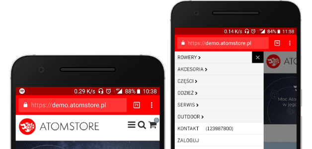 Belka menu to najważniejsza część nawigacji, do której często wracają użytkownicy. W mobilnym sklepie to co powinno znaleźć się u samej góry to przede wszystkim ikona menu, wyszukiwarka oraz koszyk. Umożliwiliśmy również szybki kontakt telefoniczny ze sklepem. W menu kategorii dodaliśmy aktywny numer telefonu, który po kliknięciu uruchamia aplikację do połączeń telefonicznych na smartfonie.