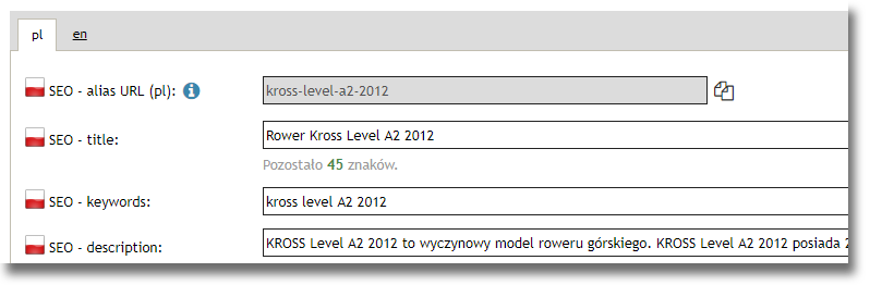 Włączenie automatycznej aktualizacja aliasów produktów pozwala systemowi na samodzielną aktualizację adresu URL przy zmianie nazwy produktu. Bywa to niezwykle przydatne, gdy importujemy duży katalog lub modyfikujemy strategię nazw produktowych (np. sklep korzystał z bardzo technicznych nazw, tłumaczy nazwy z innego języka itp). Z drugiej strony, administrator może także zablokować przypadkowe zmiany aliasów podczas edycji produktu, tak aby zabezpieczyć adresy URL o dużej wartości SEO.