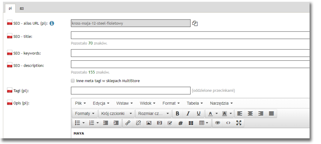 SEO-wcy docenią możliwość określenie własnego szablonu, jaki system będzie wykorzystywał do tworzenia aliasów URL produktów. Można stworzyć zarówno skrócone adresy URL (bez kategorii) lub z dodatkowymi danymi, jak producent, atrybut czy kod produktu.
