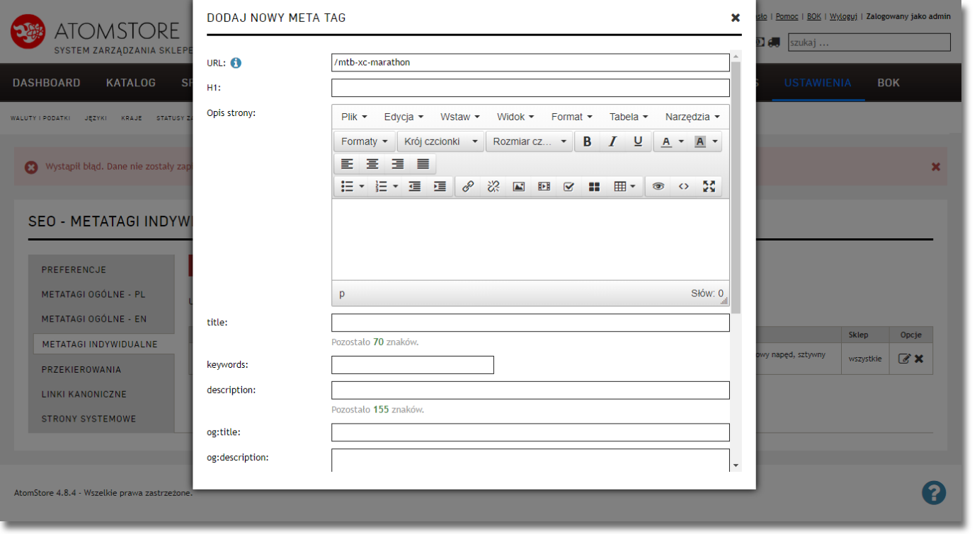 Wystarczy podać URL, a następnie zdefiniować poszczególne elementy. Gdyby tego było mało, AtomStore pozwala także na definiowanie indywidualnych opisów i nagłówków H1. Ustawienia metadanych są dostępne także przez edycje indywidualnych kartotek produktów i kategorii.