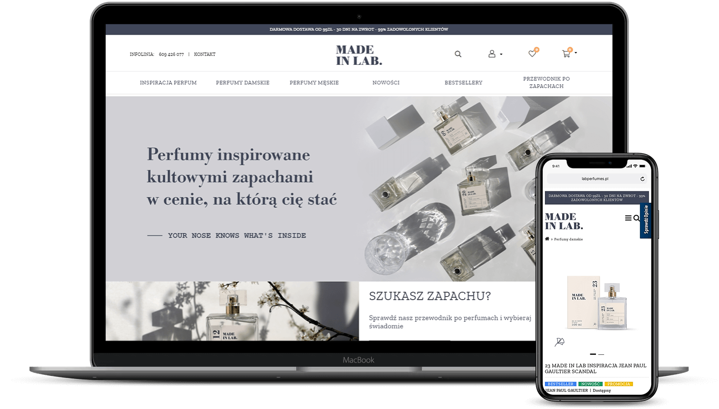 Witryna internetowa www.madeinlab.pl działa bardzo szybko. Zawartość sklepu ładuje się poniżej dwóch sekund, również na mobile'u. To, co było dla klienta jedną z ważniejszych kwestii, czyli doskonała optymalizacja platformy pod SEO, udało nam się zrealizować w 100 proc., dzięki rozbudowanemu i aktualizowanemu modułowi optymalizacji pod wyszukiwarki.