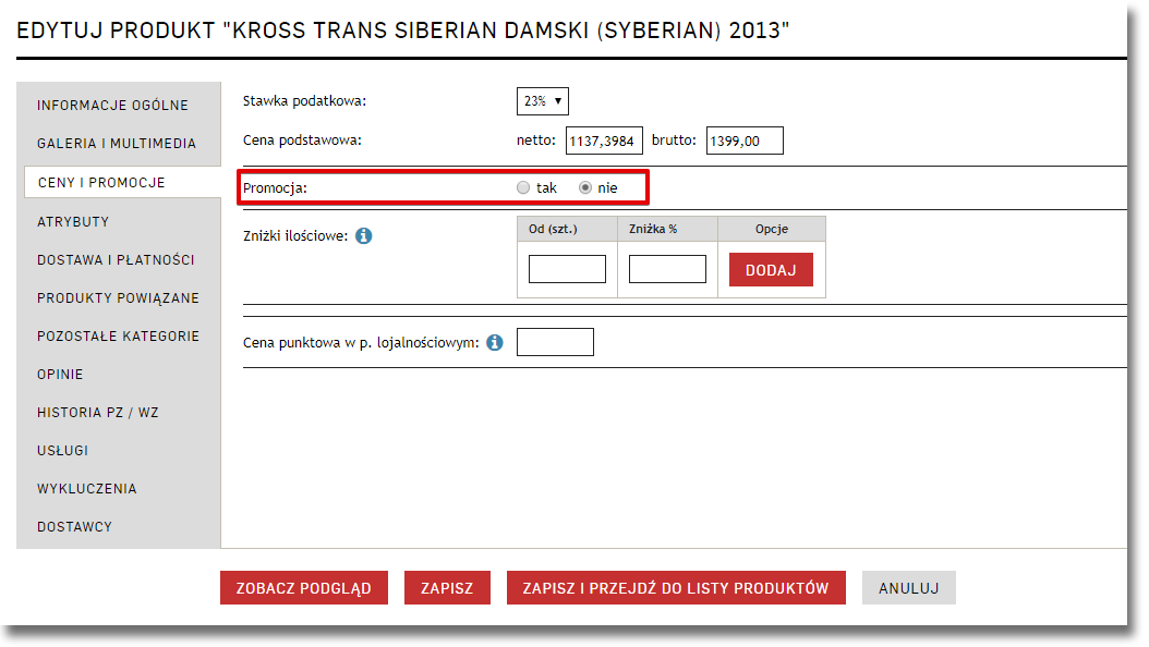 Sposób 1. W produkcie w zakładce Cena i promocje