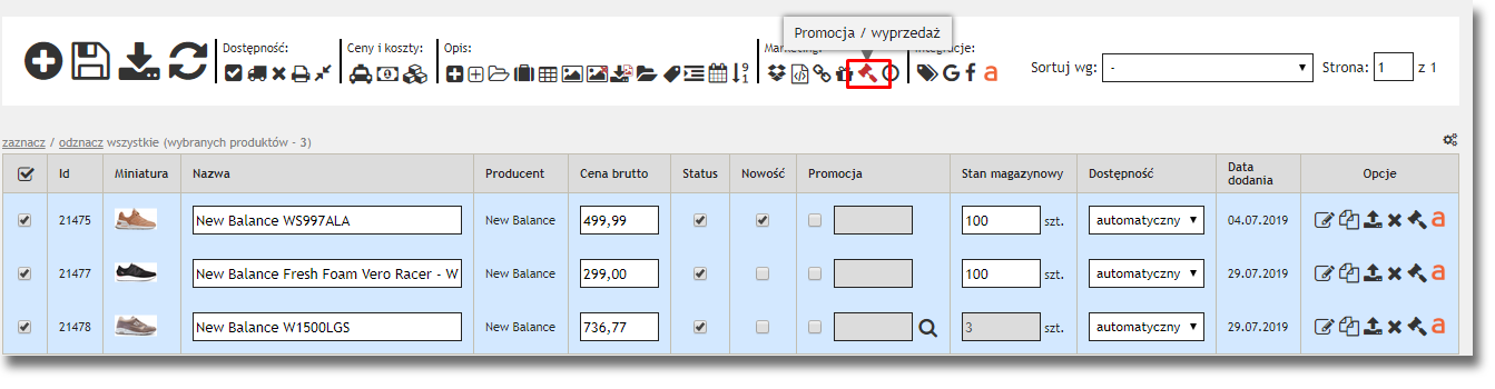 Przejdź do Katalog → Produkty i zaznacz produkty (min. 1), dla których chcesz stworzyć promocję. Następnie naciśnij ikonę młoteczka (Promocja / wyprzedaż).