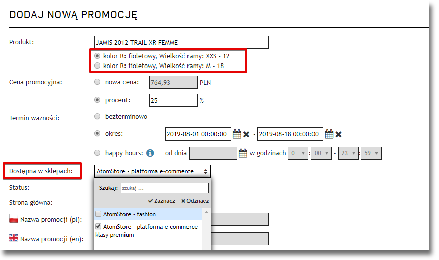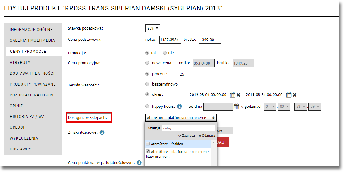 W zakładce Promocje usta cenę promocyjną (według % lub podając bezpośrednio nową cenę) oraz ustaw jej termin ważności. Na końcu, w sekcji „Dostępna w sklepach”, wybierz sklep, w którym promocja ma obowiązywać. Ustawiona w ten sposób promocja obowiązuje na wszystkie warianty produktu.